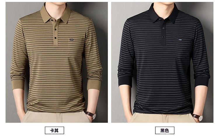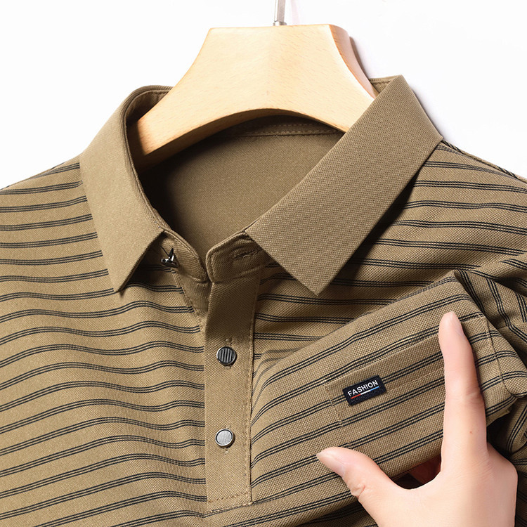 半小時前男士秋季條紋翻領POLO衫 一件 卡其