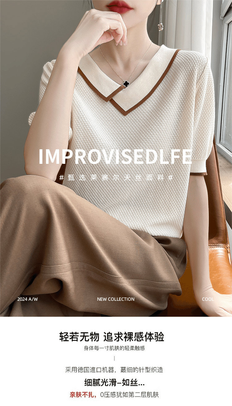 3分鐘前【兩件均價799/件】萊賽爾天絲撞色拼接娃娃領針織五分袖 兩件 米色+黑色