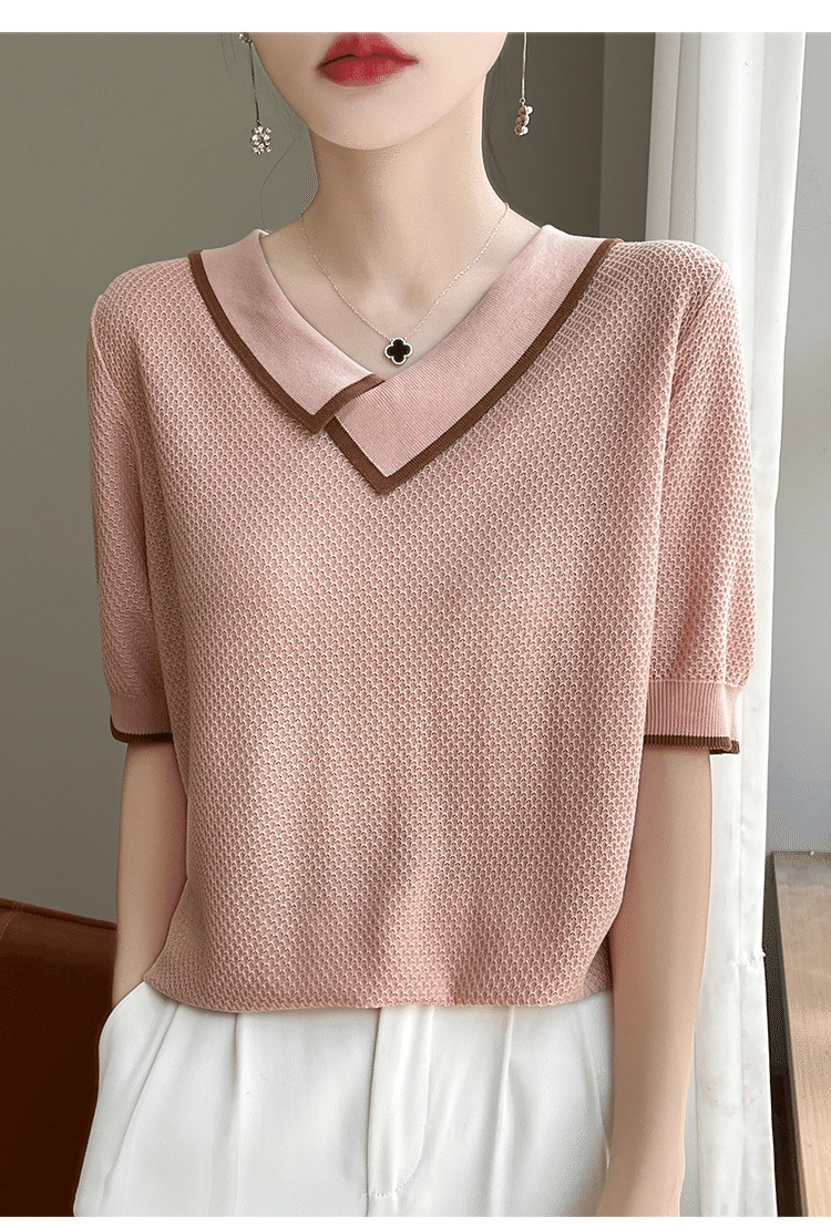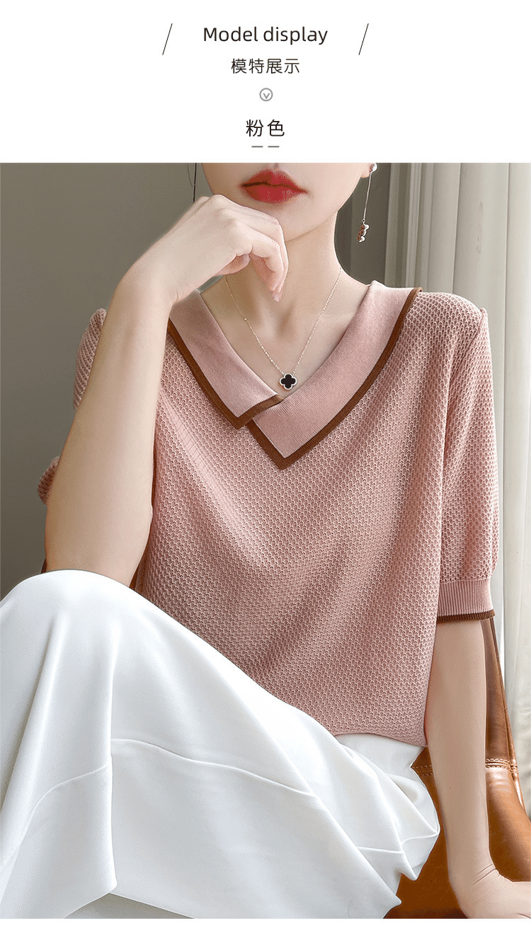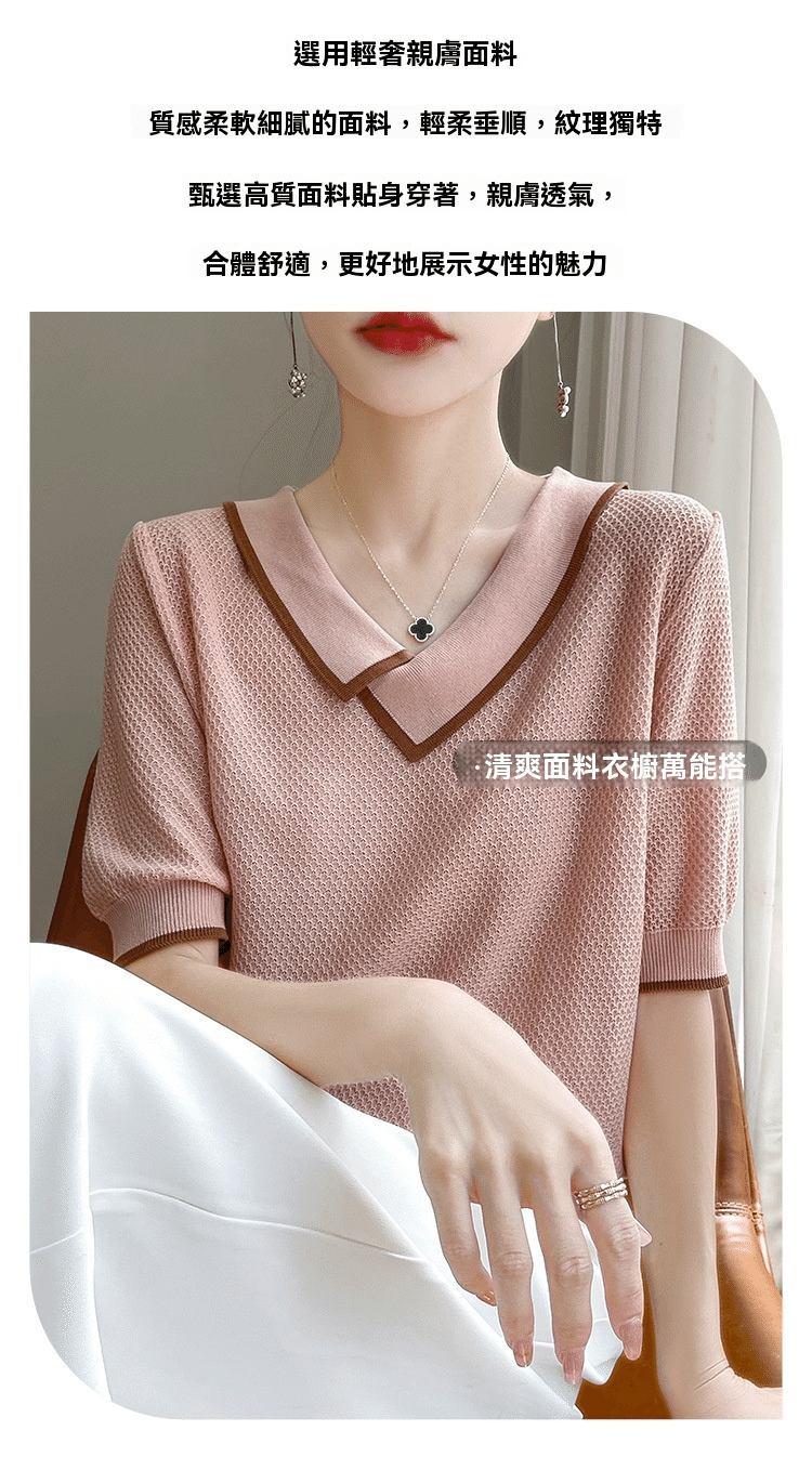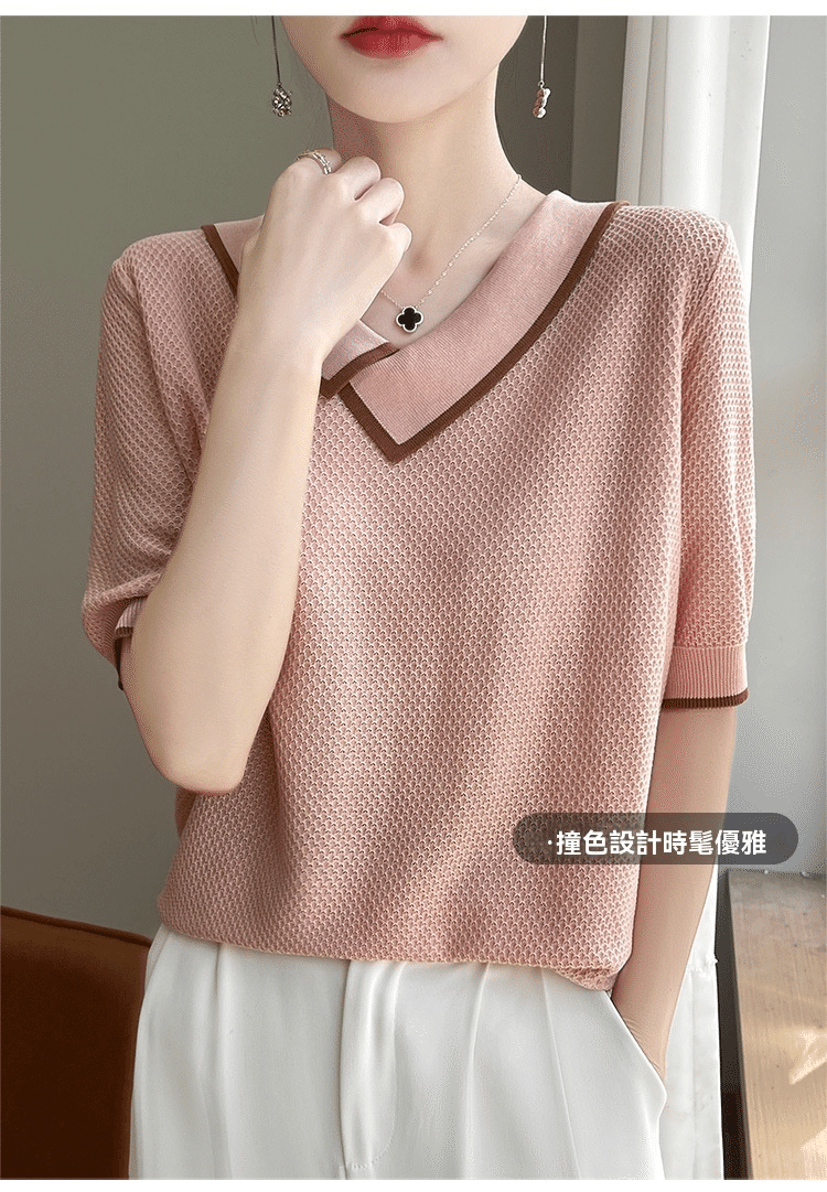 1分鐘前萊賽爾天絲撞色拼接娃娃領針織五分袖 一件 粉色