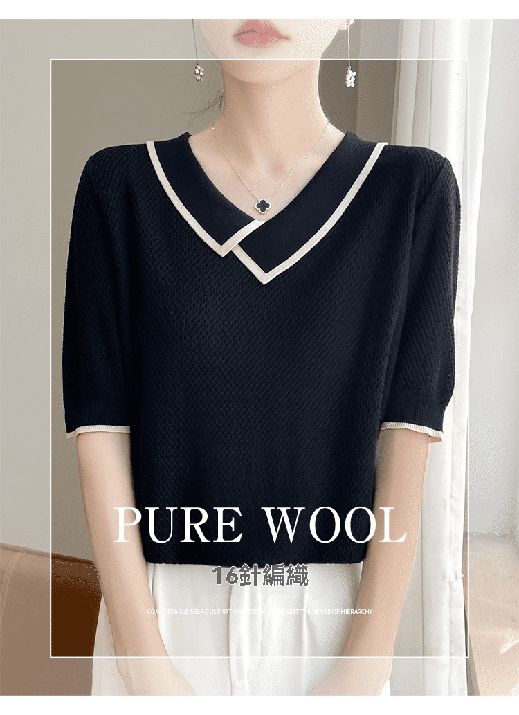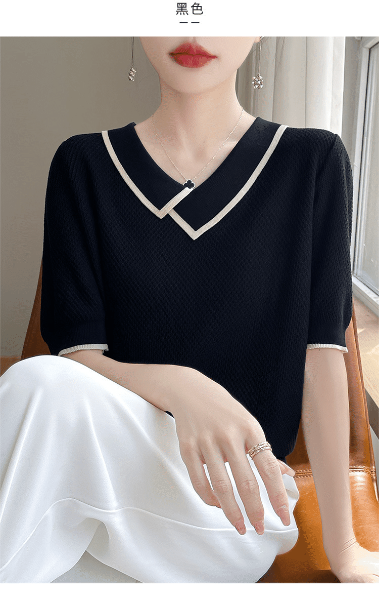 1分鐘前萊賽爾天絲撞色拼接娃娃領針織五分袖 一件 黑色