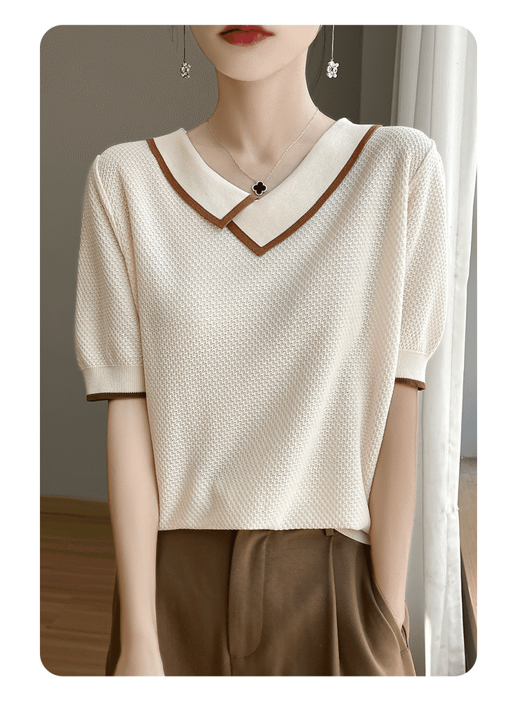 5分鐘前萊賽爾天絲撞色拼接娃娃領針織五分袖 一件 米色