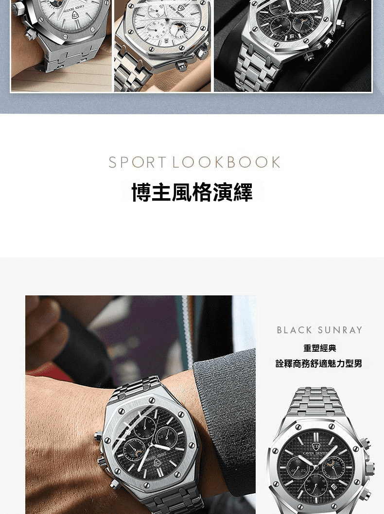 2分鐘前外貿爆款男士高檔防水三眼六針月相鋼帶手錶 鋼帶黑面
