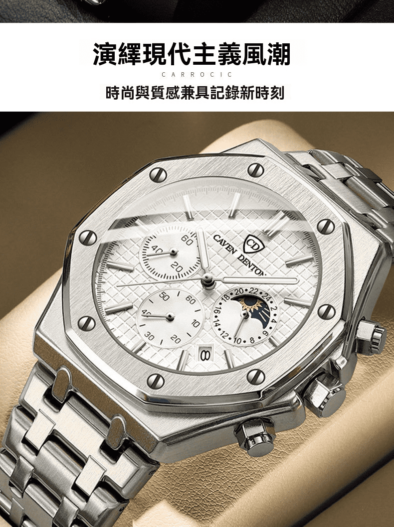 4分鐘前外貿爆款男士高檔防水三眼六針月相鋼帶手錶 鋼帶白面