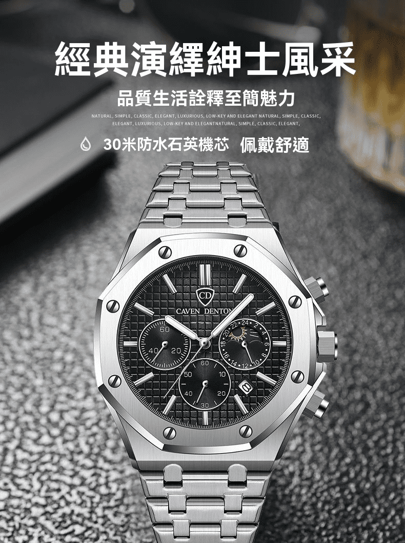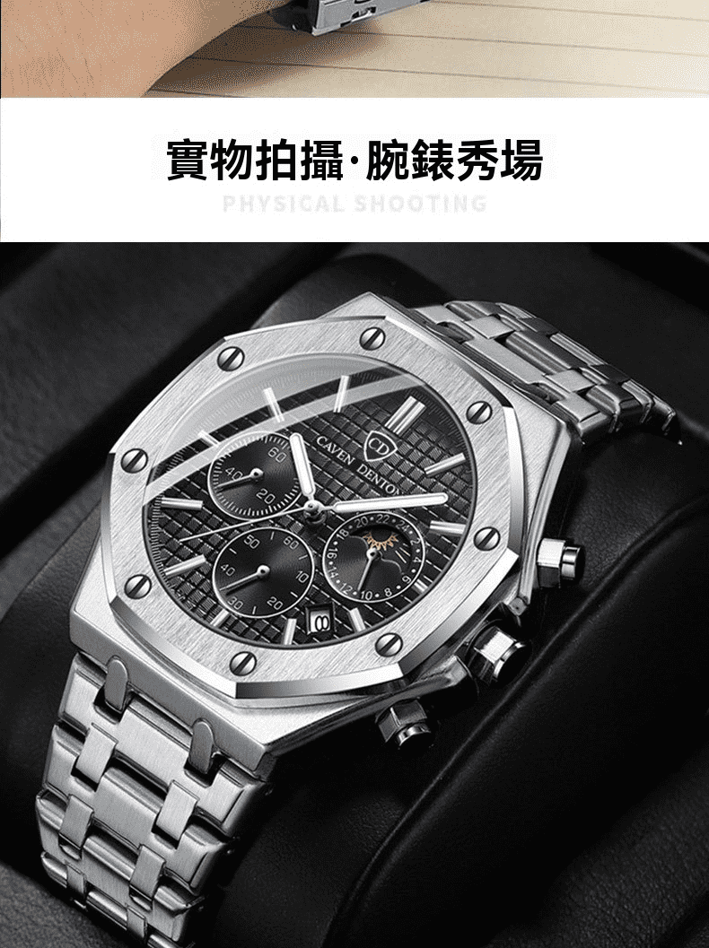 1分鐘前外貿爆款男士高檔防水三眼六針月相鋼帶手錶 鋼帶黑面