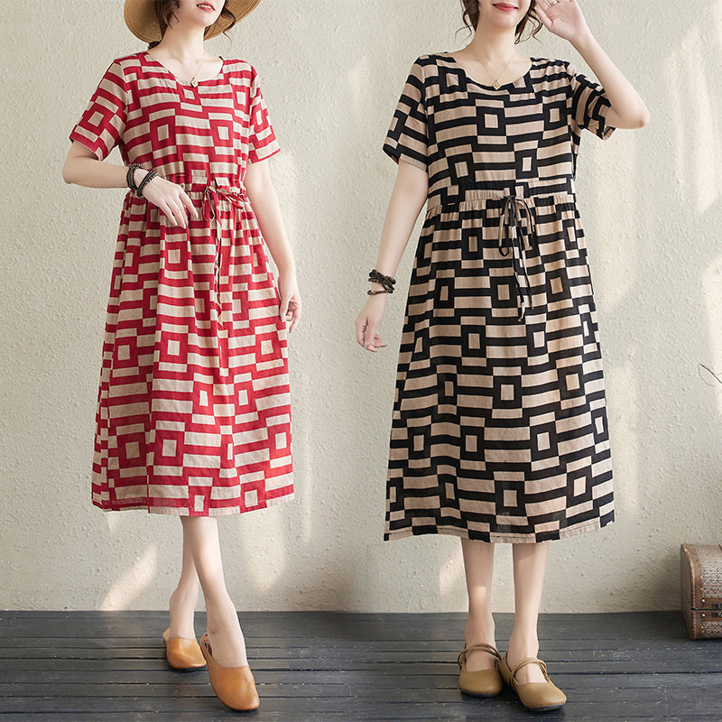 3分鐘前民族風文藝印花收腰顯瘦棉麻裙 兩件 紅色+黑色 尺碼:XL